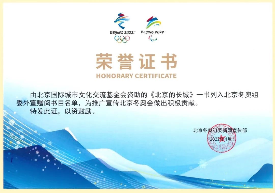 北京2022冬奥期间,《北京的长城》中文版英文版法文版被列入冬奥会外宣赠阅书目,超过10000册中文版英文版法文版已经送达北京奥运村、2022北京新闻中心、北京冬奥会主媒体中心和各赛区媒体接待站,为国际奥委会、各国奥委会及参加北京2022年冬奥会的国际组织、参赛嘉宾、冬奥友人和媒体记者搭建一座中西跨文化交流的桥梁。