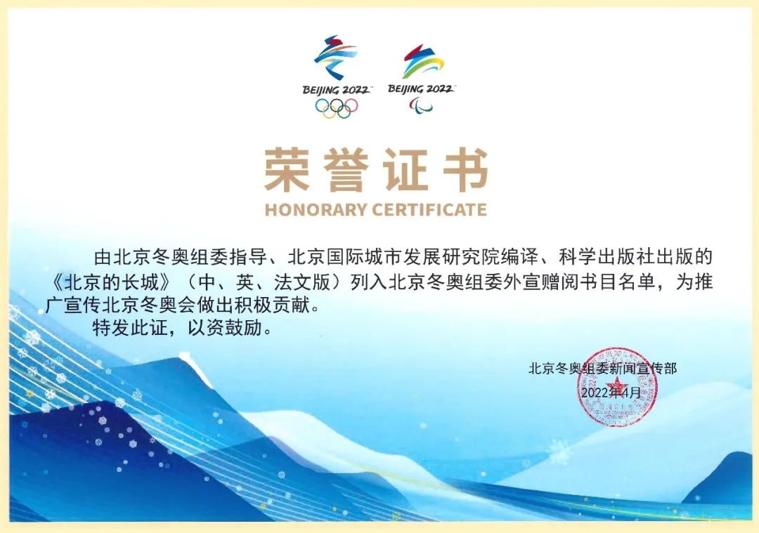 《北京的长城》中文版英文版法文版,是在北京2022年冬奥会和冬残奥会组织委员会支持指导下,由北京国际城市发展研究院、北京国际城市文化交流基金会联合科学出版社、法国EDP出版社共同研究、编撰、翻译、出版的。《北京的长城》是北京2022年冬奥会和冬残奥会推动中国传统文化与奥林匹克文化相互融合的一个开创性成果,成为北京冬奥文化盛宴的一大亮点。
