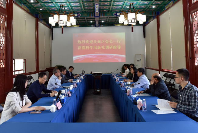 吴尚之一行首先来到《中国科学》杂志社,详细了解了科学出版社科技期刊出版的历史与发展现状,并与各学科编辑部的工作人员进行交流。
