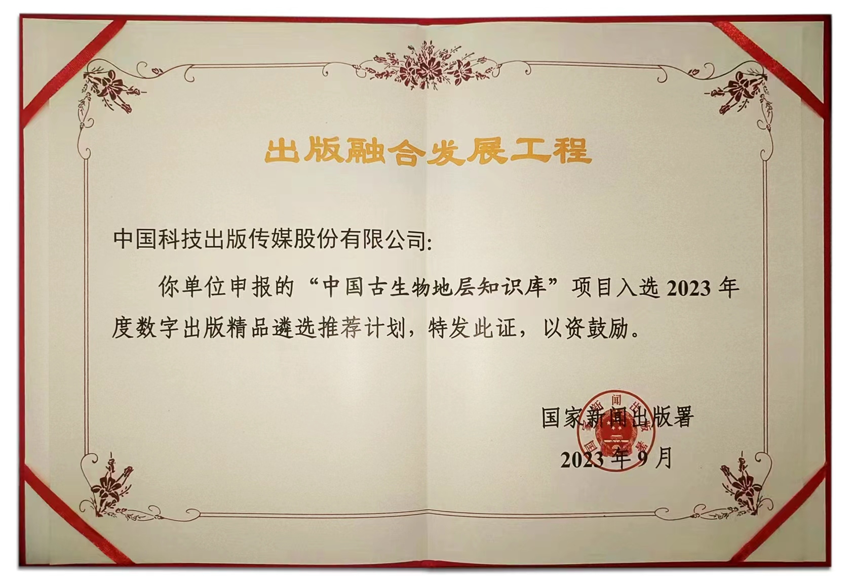 2023年9月18日,国家新闻出版署发布《国家新闻出版署关于公布2023年度出版融合发展工程入选名单的通知》,“中国古生物地层知识库”入选2023年度数字出版精品遴选推荐计划。