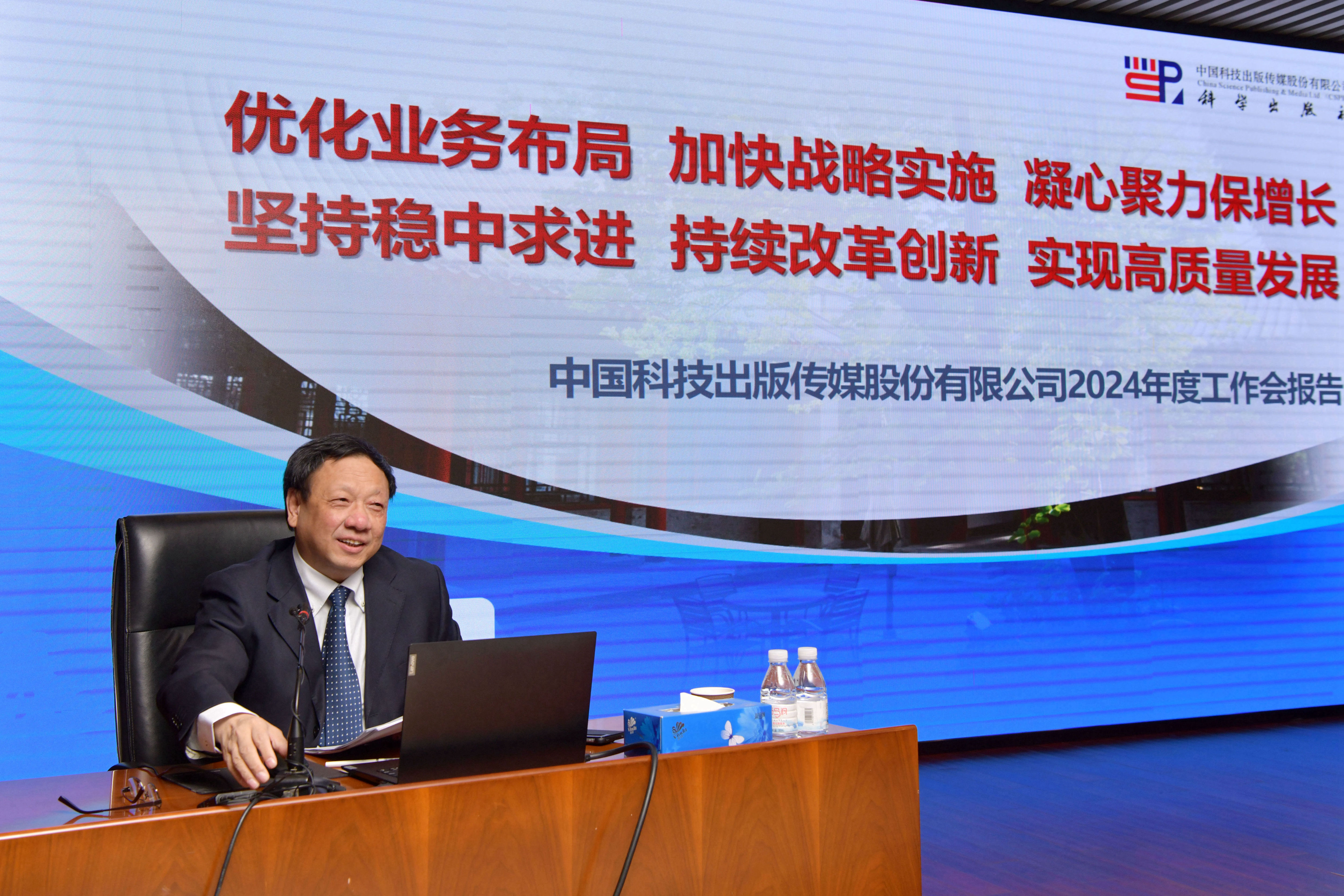 党委书记、董事长、总经理胡华强作了题为“优化业务布局,加快战略实施,凝心聚力保增长;坚持稳中求进,持续改革创新,实现高质量发展”的大会主题报告,在全面回顾2023年公司总体工作的基础上,研判发展形势,明确了2024年公司工作指导思想和总体任务,提出了“稳健增长、优化布局、鼓励创新、规范管理、重在执行”的工作方针;并部署了公司2024年的八项重点工作:第一,要强化企业党建,提高政治站位,引领企业发展。第二,要充分认识高质量发展是硬道理,业绩增长是金标准。第三,要聚焦主责主业,落实内容集聚战略。第四,要统筹兼顾发展,推动品牌战略落地。第五,要谋划顶层设计、加快自主创新,瞄准世界标准,扎实推进知识服务转型升级。第六,要把握竞争态势,增强国际传播效能。第七,要强化多措并举,建设专业人才队伍。第八,要强化对分子公司的有效治理。